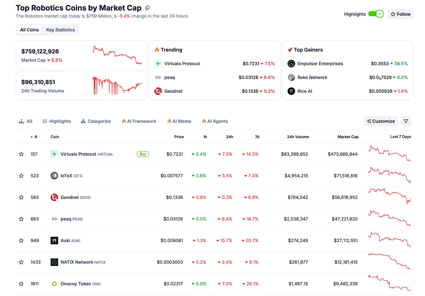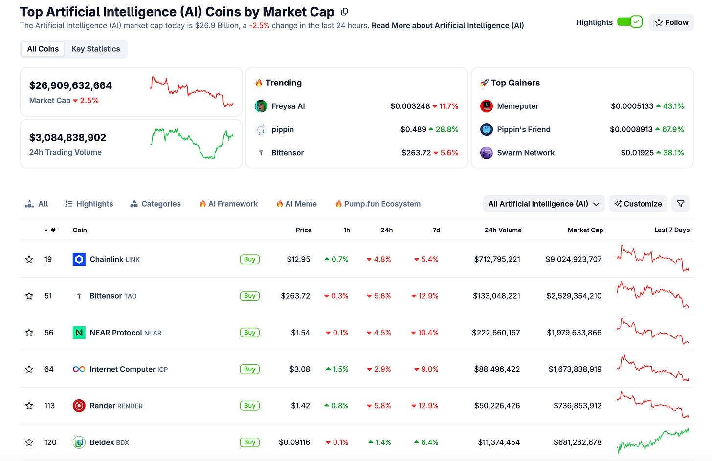 The overall DeAI market cap is down $1.9m (-7%) this week, consistent with the broader crypto market pullback: