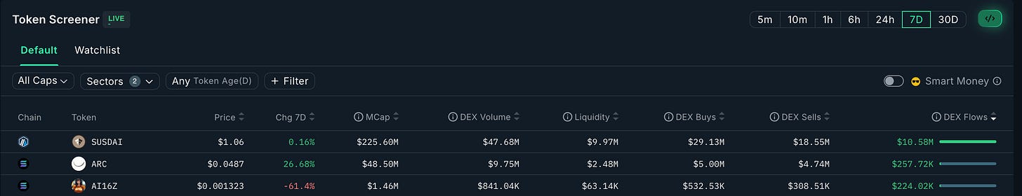 ARC and AI16Z follow behind as speculation continues around a resurgence of the well known AI protocol tokens. Pippin also saw positive price action among a sea of red this week.