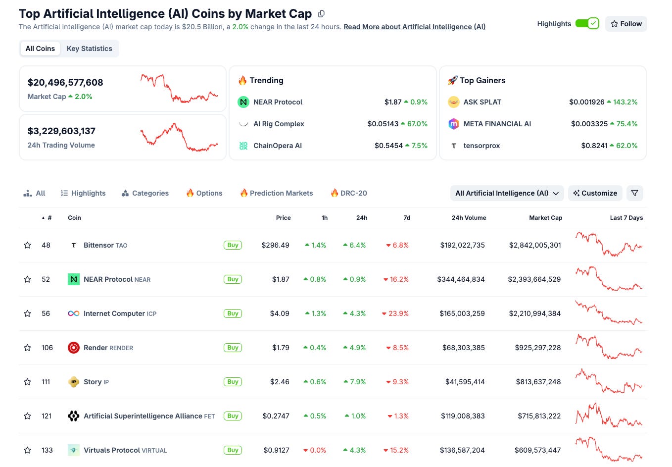The overall DeAI market cap is down by $2bn (-9%) to $20.5bn: